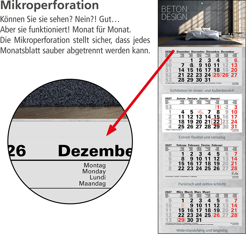 Microperforation der Monatsblöcke für ein rückstandsfreies und einfaches Abreißen der Blätter