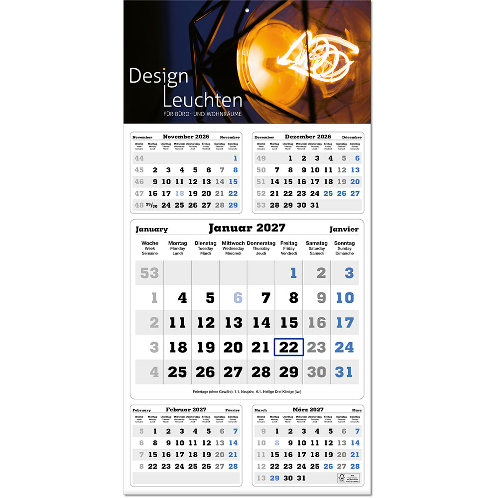 Farben für Untergrund des Vor- und Nachmonats: grau Hauptmonat weiß Feiertage blau |