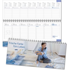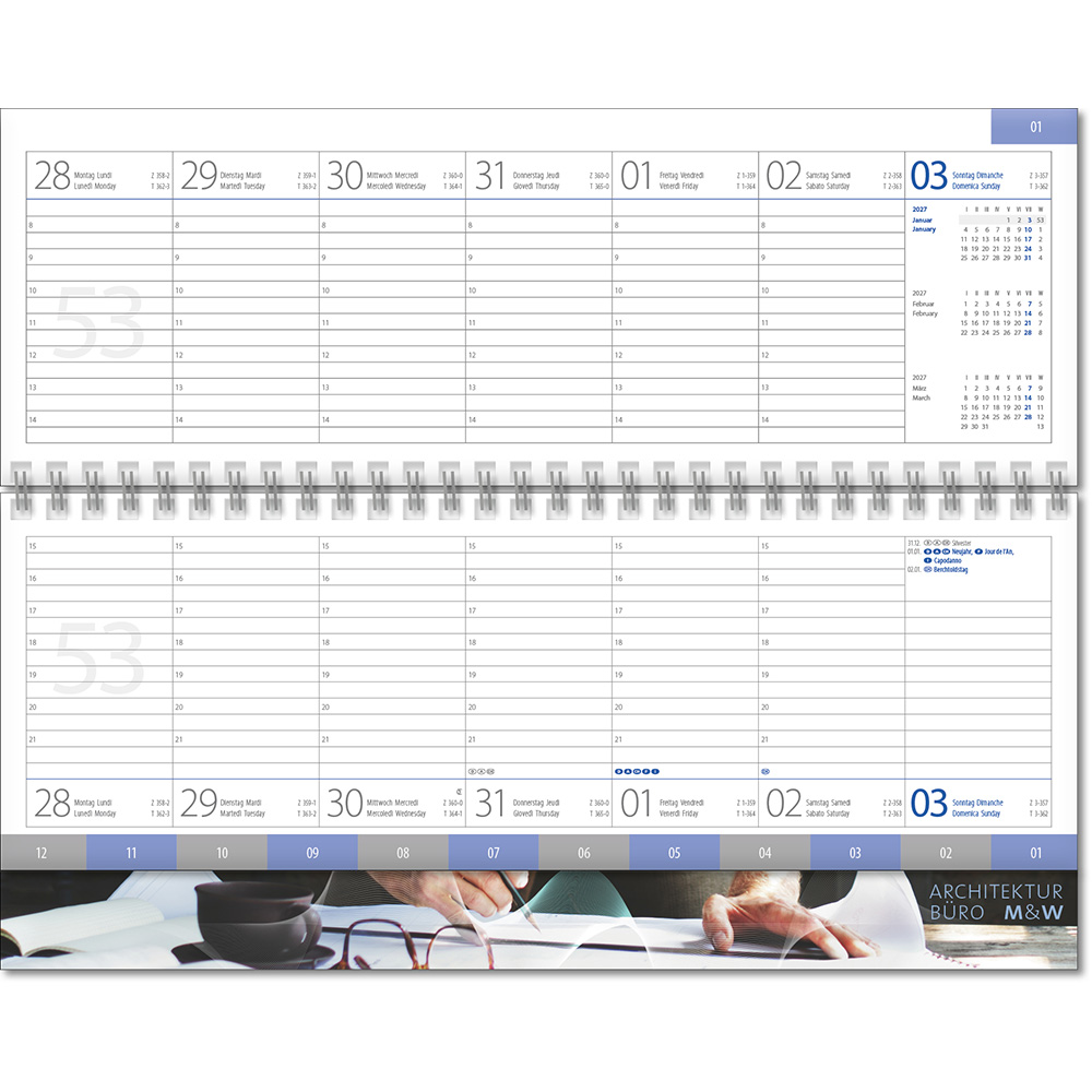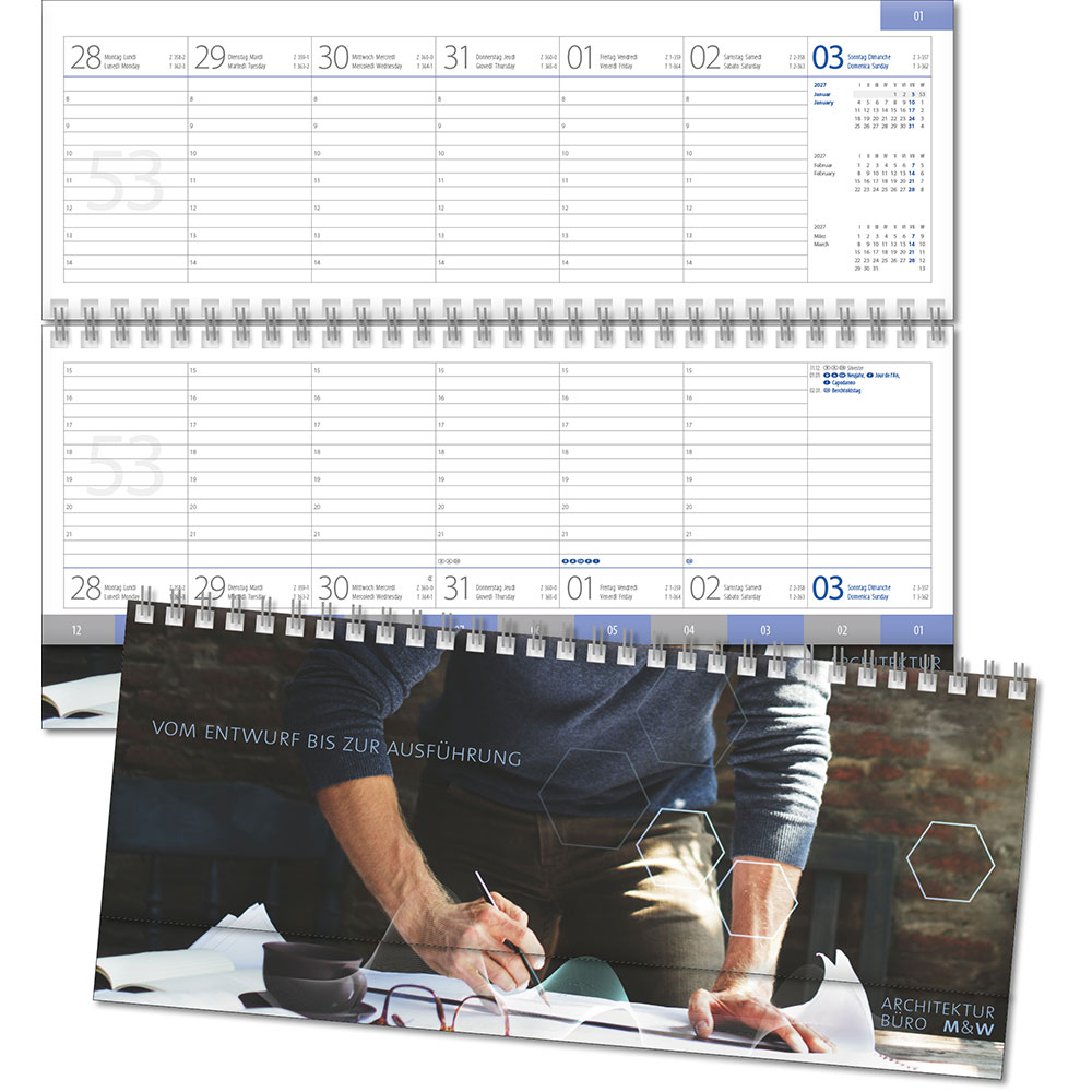 internationales Kalendarium Angabe der Kalenderwochen 7 Spalten pro Woche und 3-Monatsübersicht Tages- und Zinszählung Halbstundeneinteilung, oberes Blatt 8-14 Uhr, unteres Blatt 15-21 Uhr Jahres- und Monatsübersichten, Ferientermine D/A/CH 12-teilige Monatsregisterstanzung |