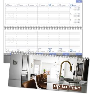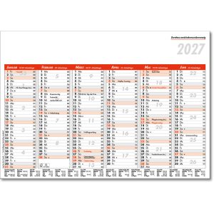 einsprachiges Kalendarium Angabe der Kalenderwochen 7 Spalten pro Woche und 3-Monatsübersicht Tages- und Zinszählung Halbstundeneinteilung, oberes Blatt 8–14 Uhr, unteres Blatt 15–21 Uhr Jahres- und Monatsübersichten, Ferientermine D/A/CH |